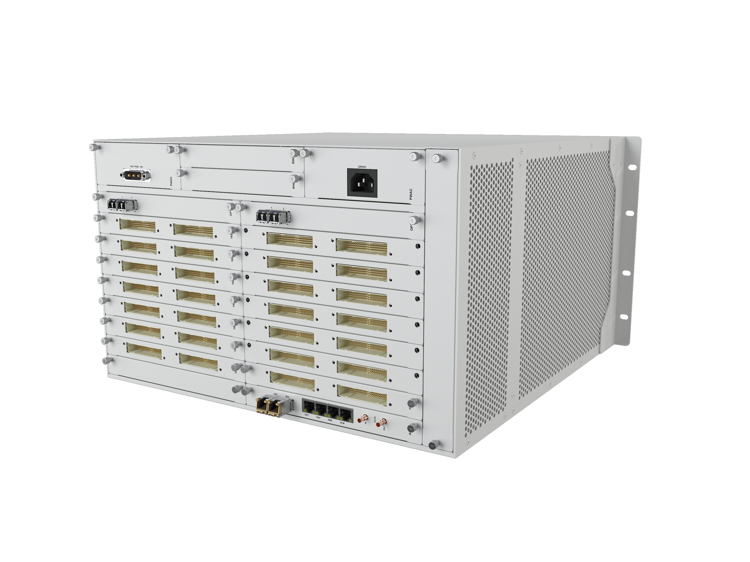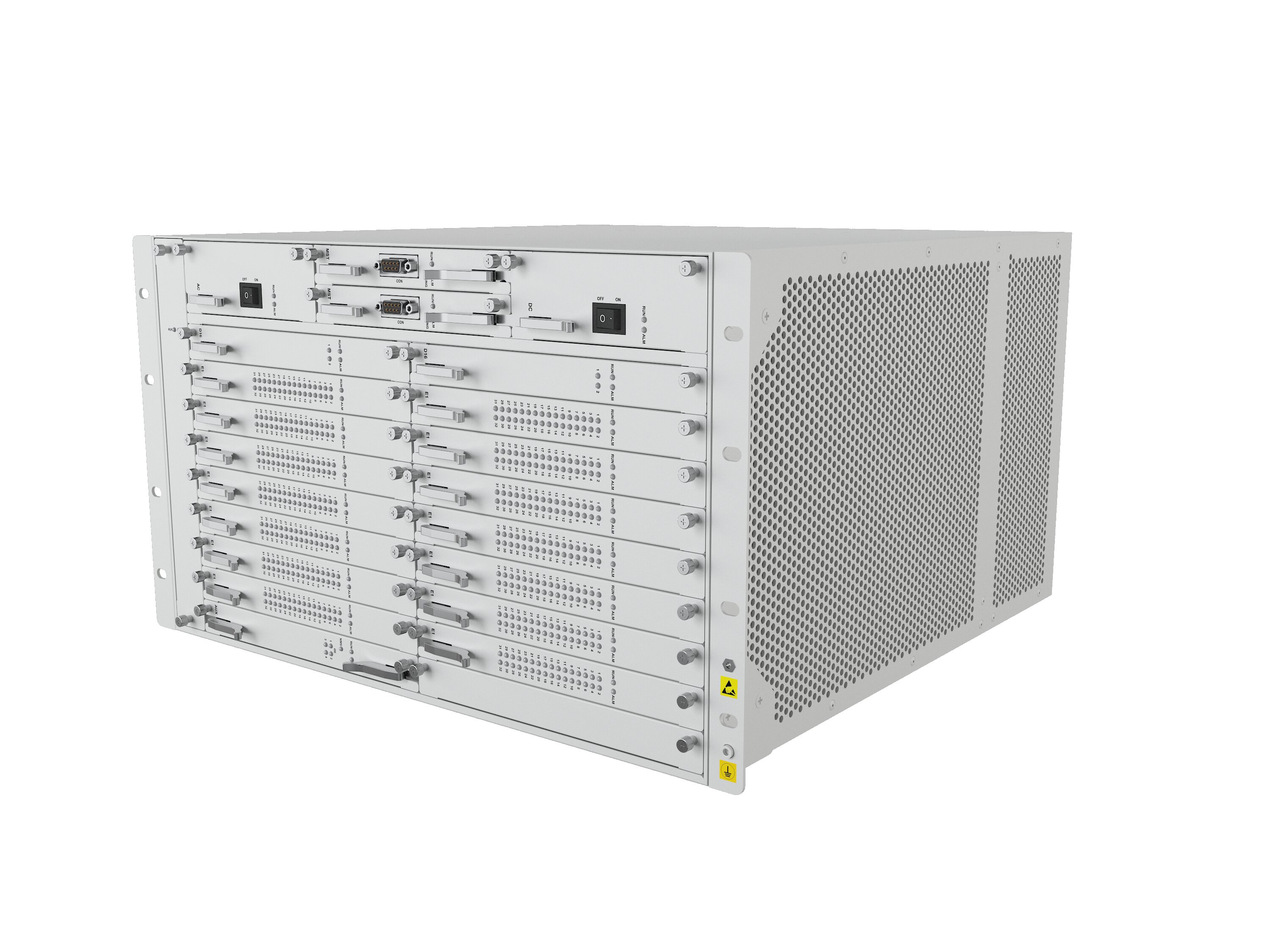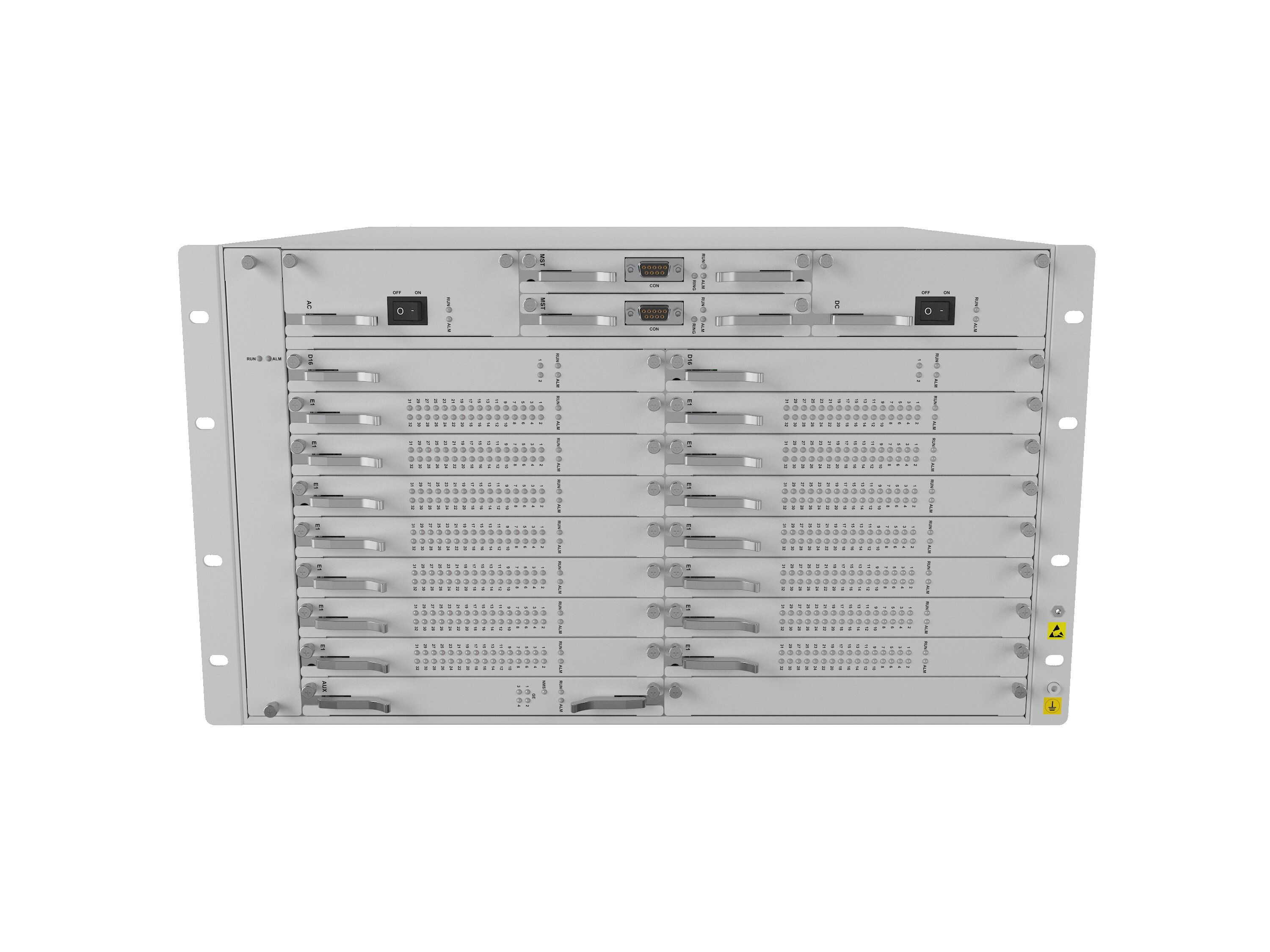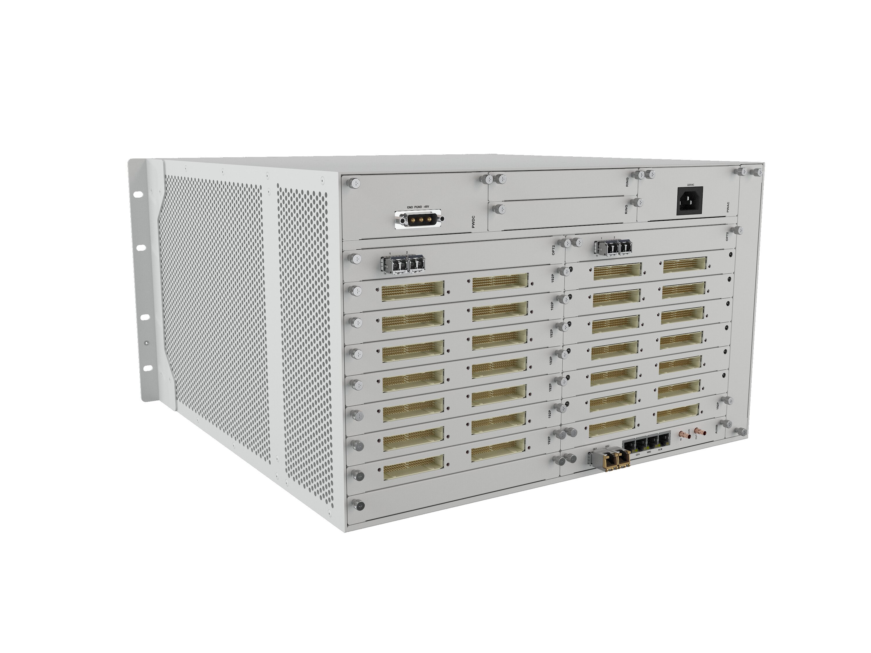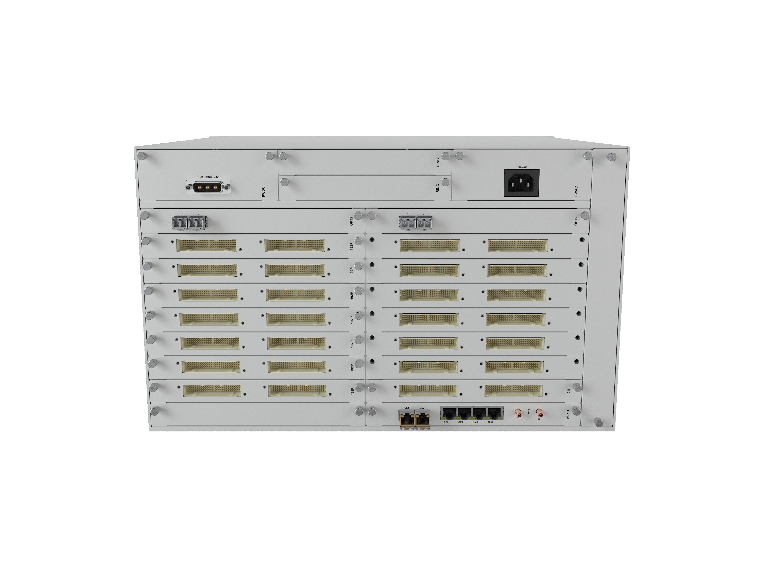 单台设备最大支持两个电源,两个主控,224路E1,4路 2.5G光口,支持断电直通功能