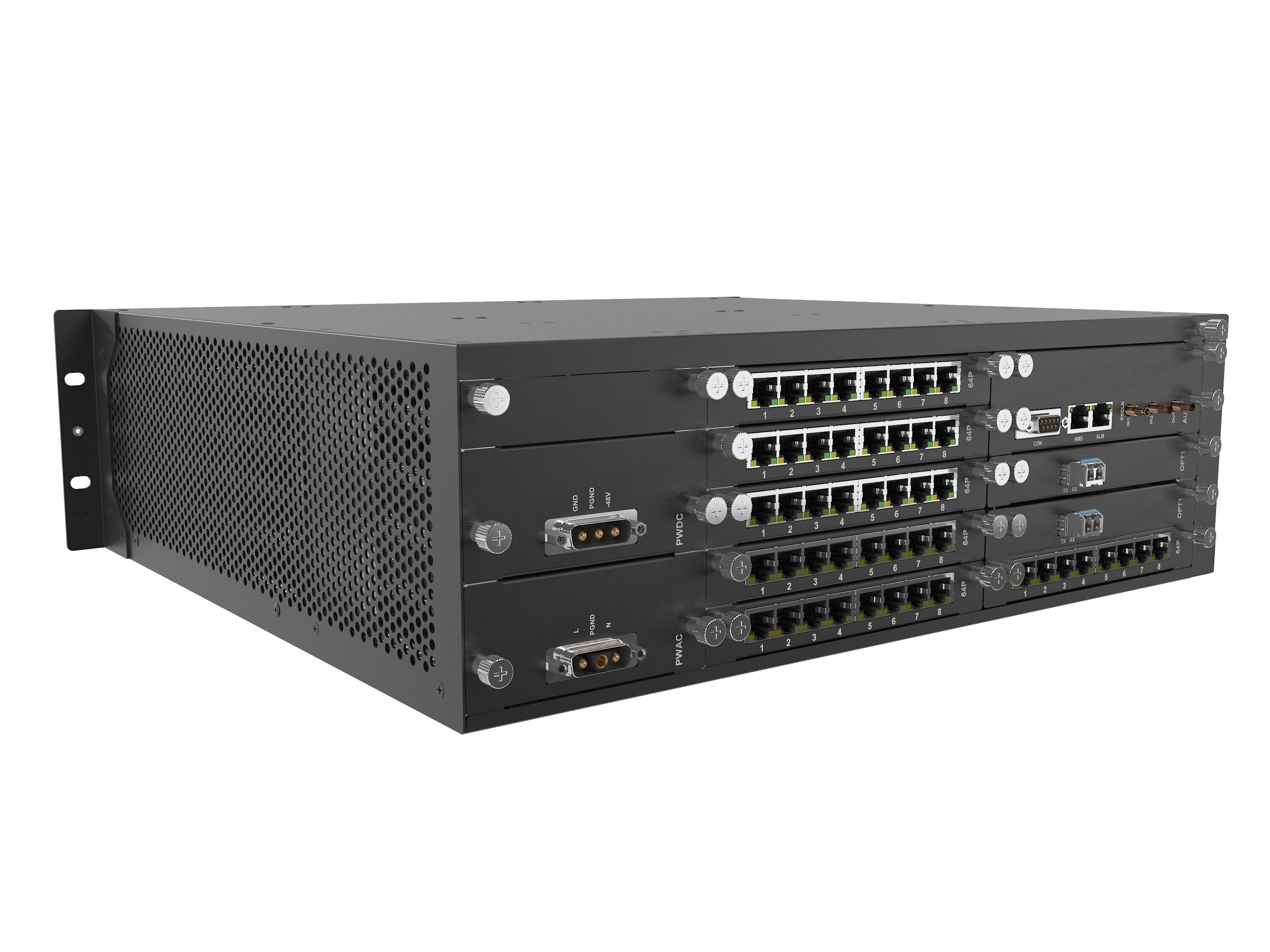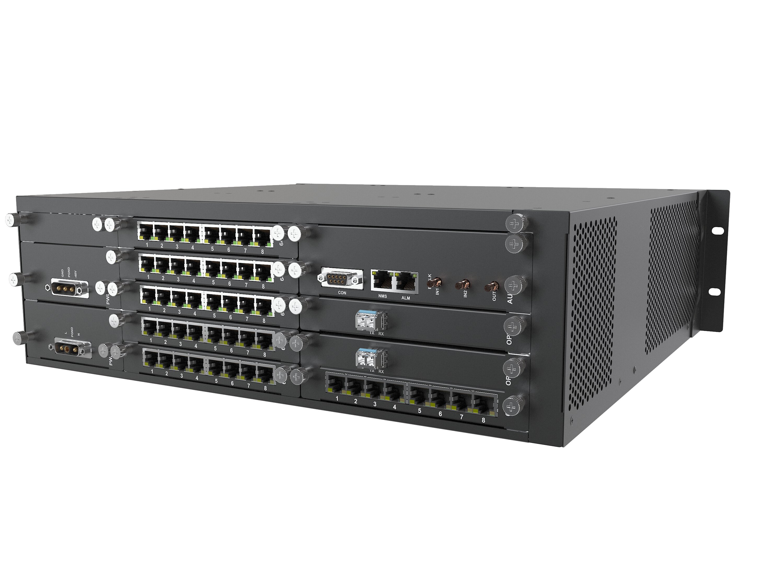 The PT-3000 intelligent digital distribution frame system adopts 3U high and standard 19 inch rack. one device supports full cross-connection for 96 E1 channels, and the system is equipped with 2 x 2.5G optical interfaces, supporting ring, link and star networking topologies.