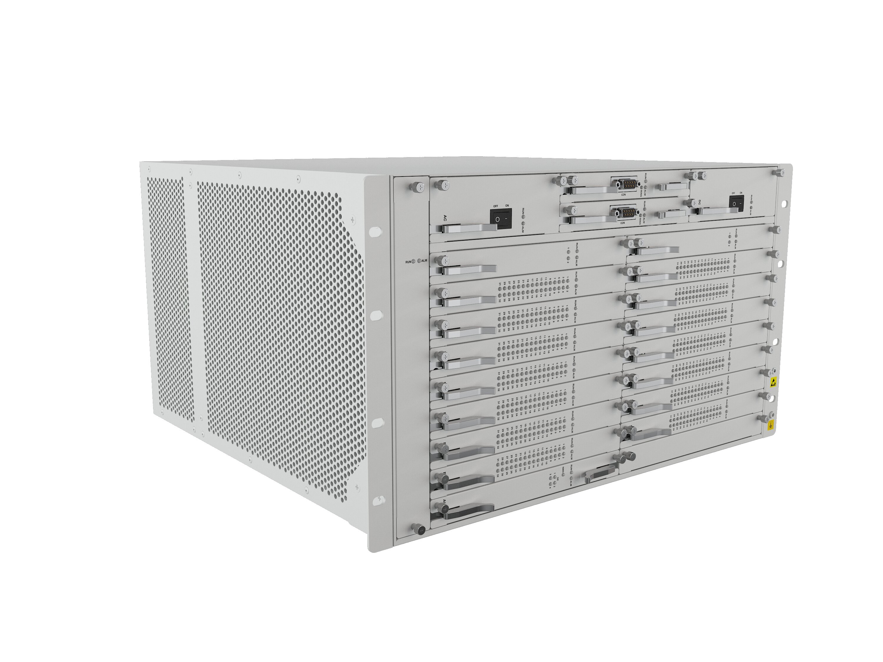 单台设备最大支持两个电源,两个主控,224路E1,4路 2.5G光口,支持断电直通功能